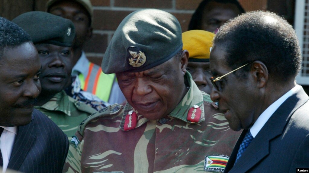 Zimbabwe's President Robert Mugabe, right, talks to General Constantine Chiwenga (center) - Photo copyright REUTERS